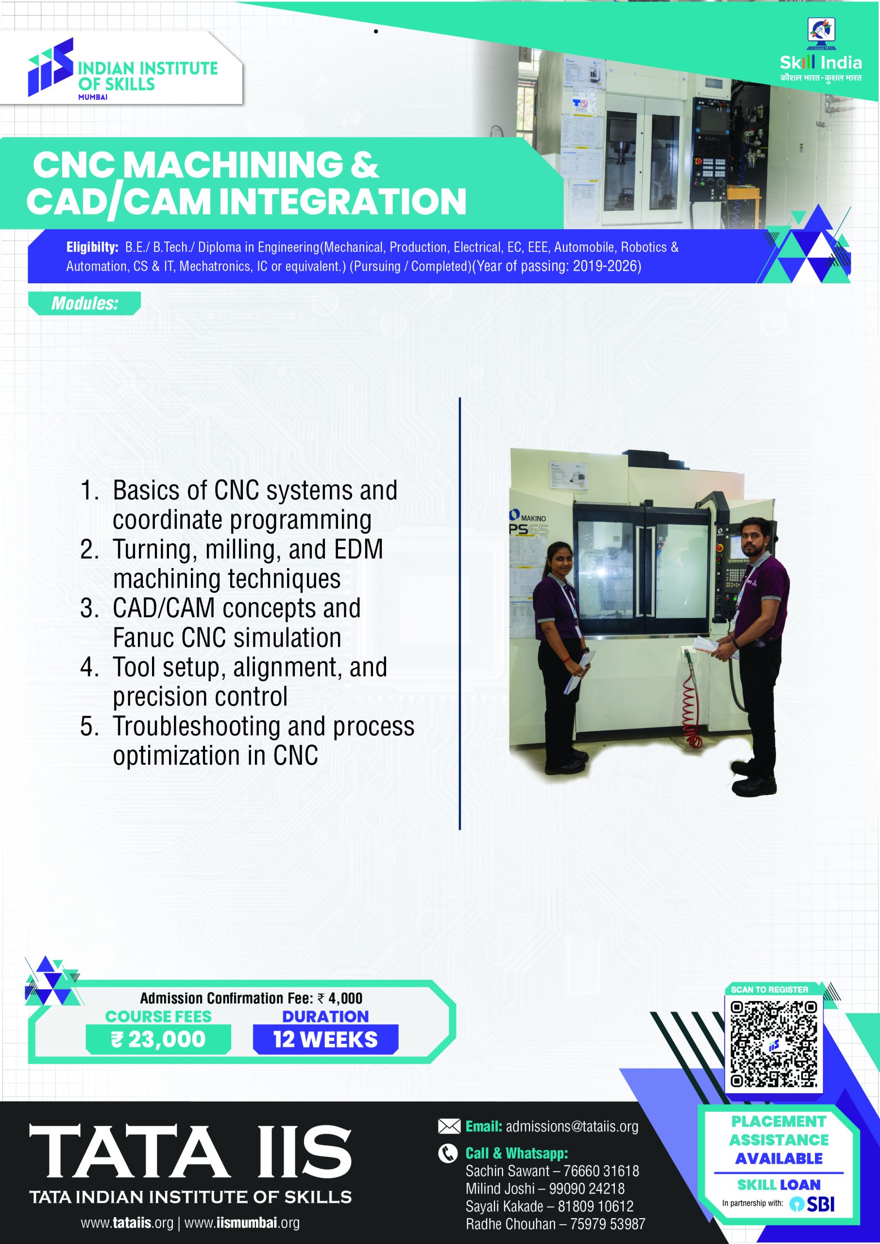 Step into the future of advanced manufacturing with the CNC Machining & CAD/CAM Integration program. This course is designed to equip you with industry-ready skills in CNC operations, precision machining, and digital manufacturing workflows. Learn to work with modern CNC systems, understand CAD/CAM software integration, and master the machining processes that power today’s smart factories. Through hands-on practice at our world-class skill centre, you will gain real-time exposure to CNC programming, simulation, tool setup, troubleshooting, and process optimisation. Build the confidence and competence required to excel in high-demand manufacturing and engineering job roles.